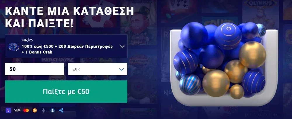 Προσφέρουμε σε Έλληνες παίκτες bonus καλωσορίσματος 100% έως 500 € συν 200 free spins και ένα ειδικό παιχνίδι Bonus Crab. Η ελάχιστη κατάθεση για ενεργοποίηση του bonus είναι 20 €. Το bonus υπόκειται σε απαίτηση στοιχηματισμού 35x (bonus + κατάθεση), τα free spins προστίθενται ανά 20 ημερησίως για 10 ημέρες. Το μέγιστο στοίχημα κατά τη διάρκεια του στοιχηματισμού είναι 5 € και το bonus ισχύει για 30 ημέρες από την ενεργοποίηση.