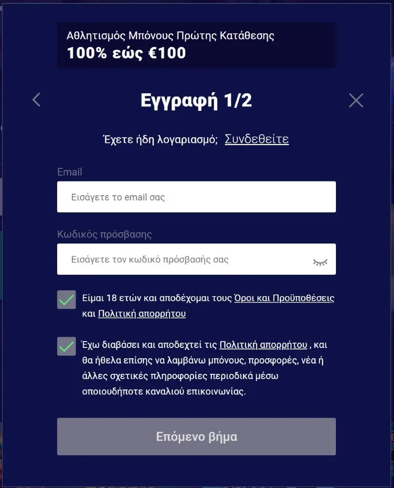 Τα bonus καζίνο και αθλητικών στοιχημάτων δεν μπορούν να συνδυαστούν — κατά την εγγραφή επιλέγετε τον προτιμώμενο τύπο bonus. Όλες οι προσφορές bonus μας έχουν σχεδιαστεί με στόχο την παροχή δίκαιων όρων τηρώντας τις αρχές υπεύθυνου παιχνιδιού. Συνιστούμε πάντα να διαβάζετε προσεκτικά τους τρέχοντες όρους κάθε προσφοράς πριν την ενεργοποιήσετε.